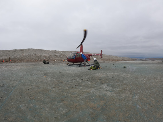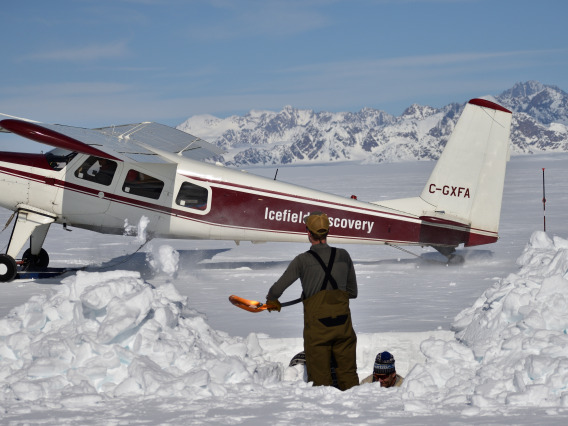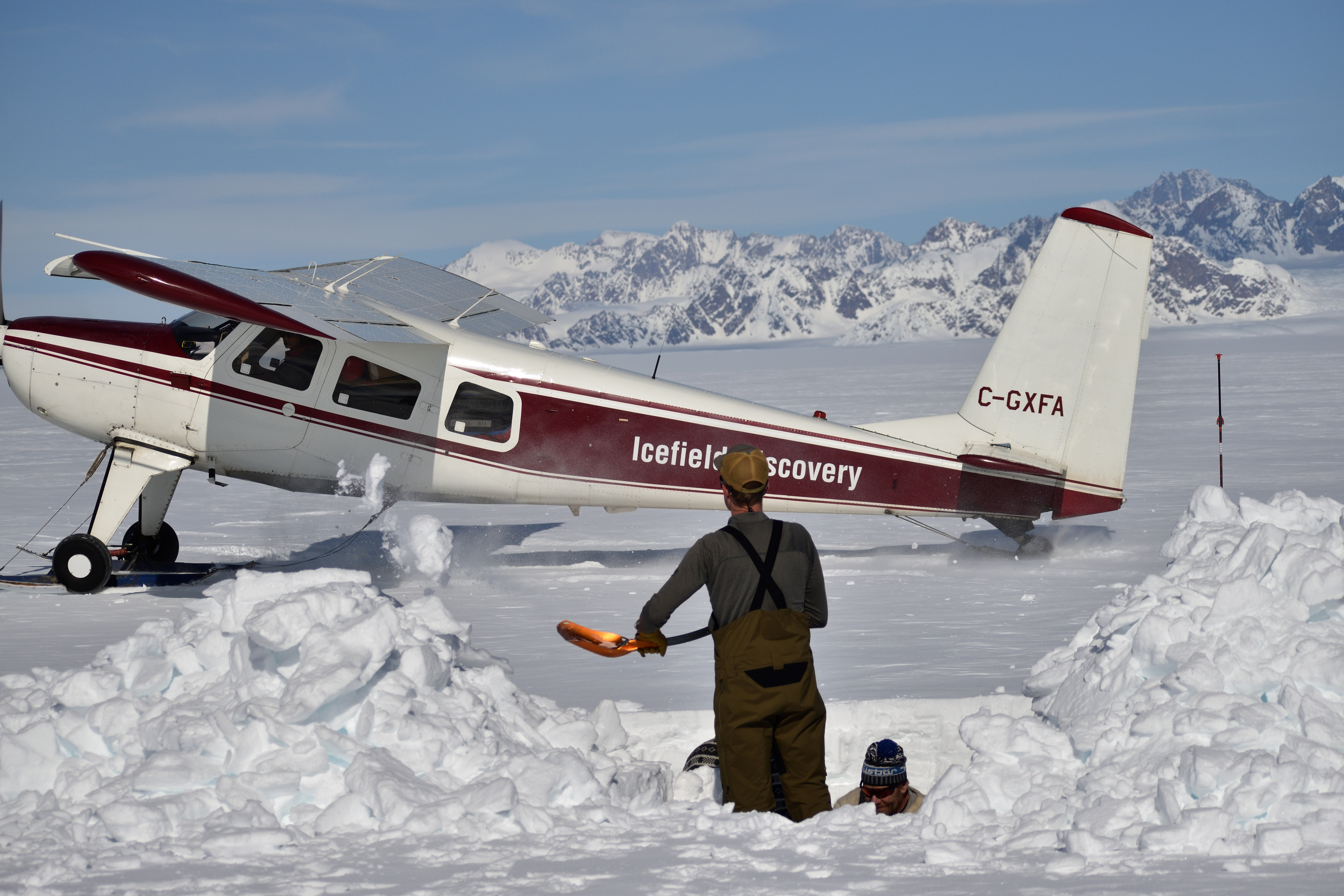 2023: The digging of a snow pit is in progress on the Seward Glacier as the last of the field team arrives via Helio Courier with Icefield Discovery.