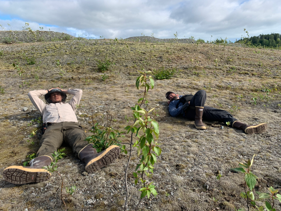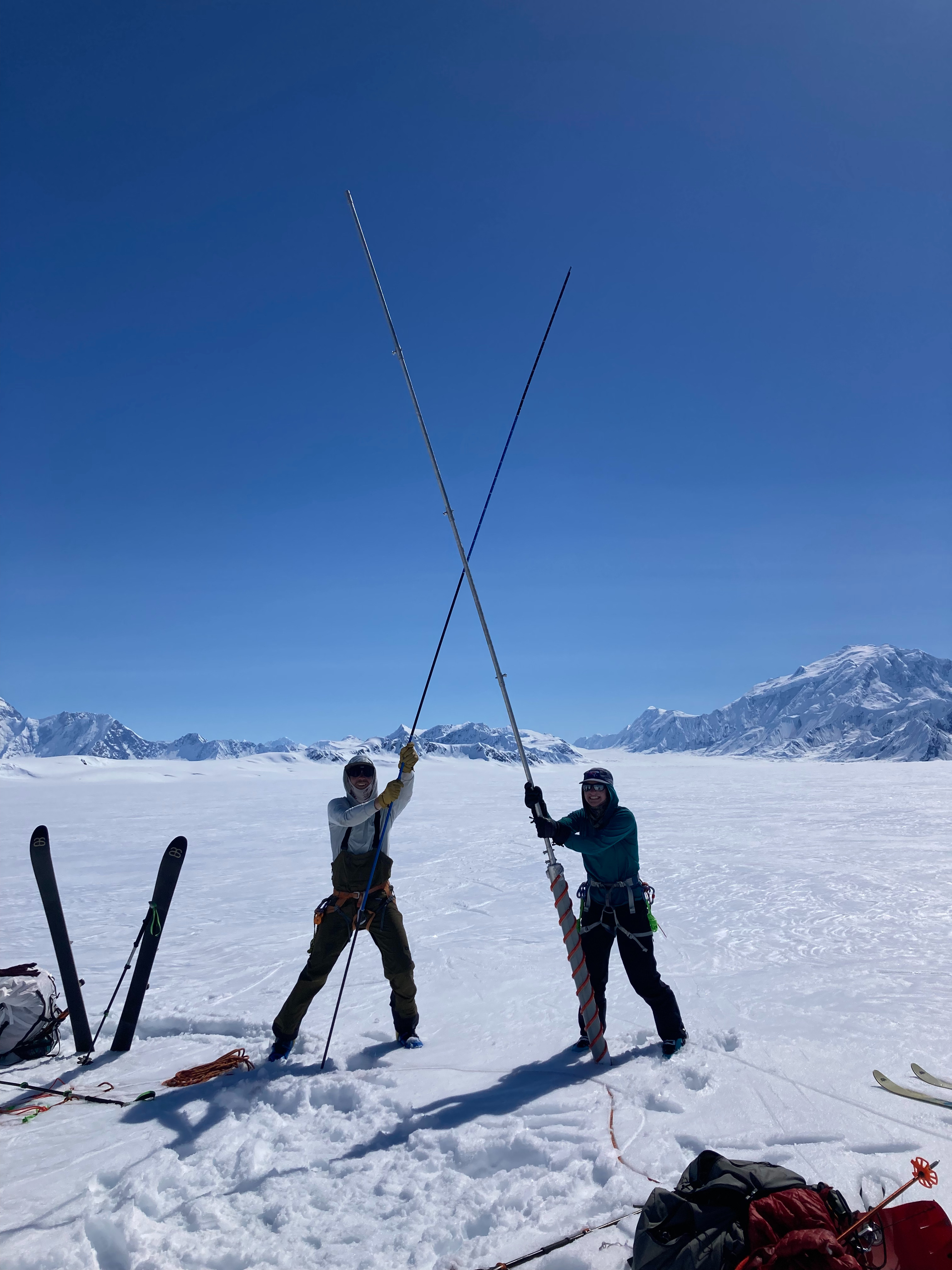 2023: Doug and Kailey holding a snow probe (left) and Kovacs corer (right) after drilling.