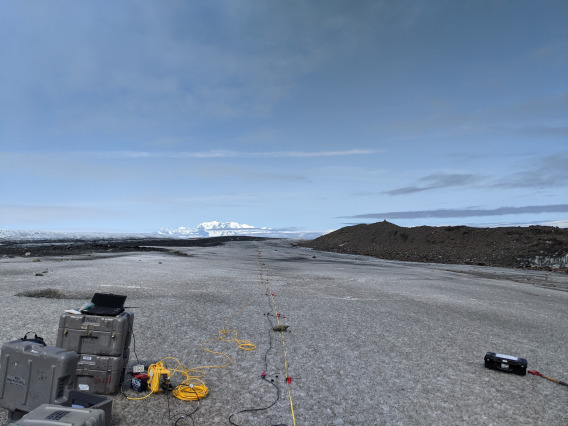 2023: The team taking a break from skiing with the shallow radar system. The shallow radar is in the blue sled at the back of the rope team.