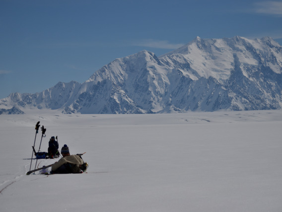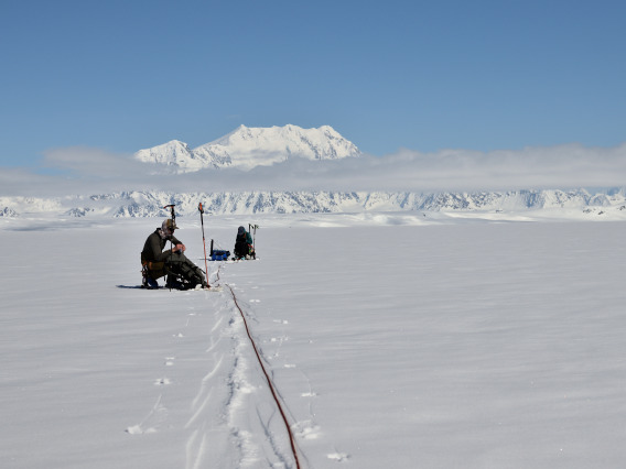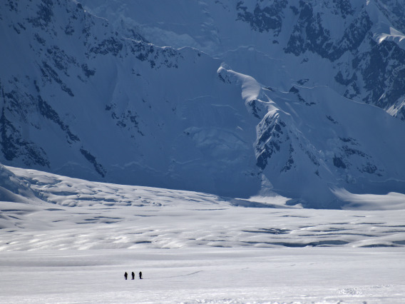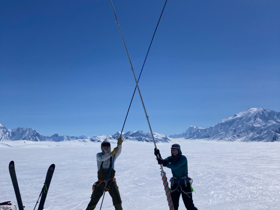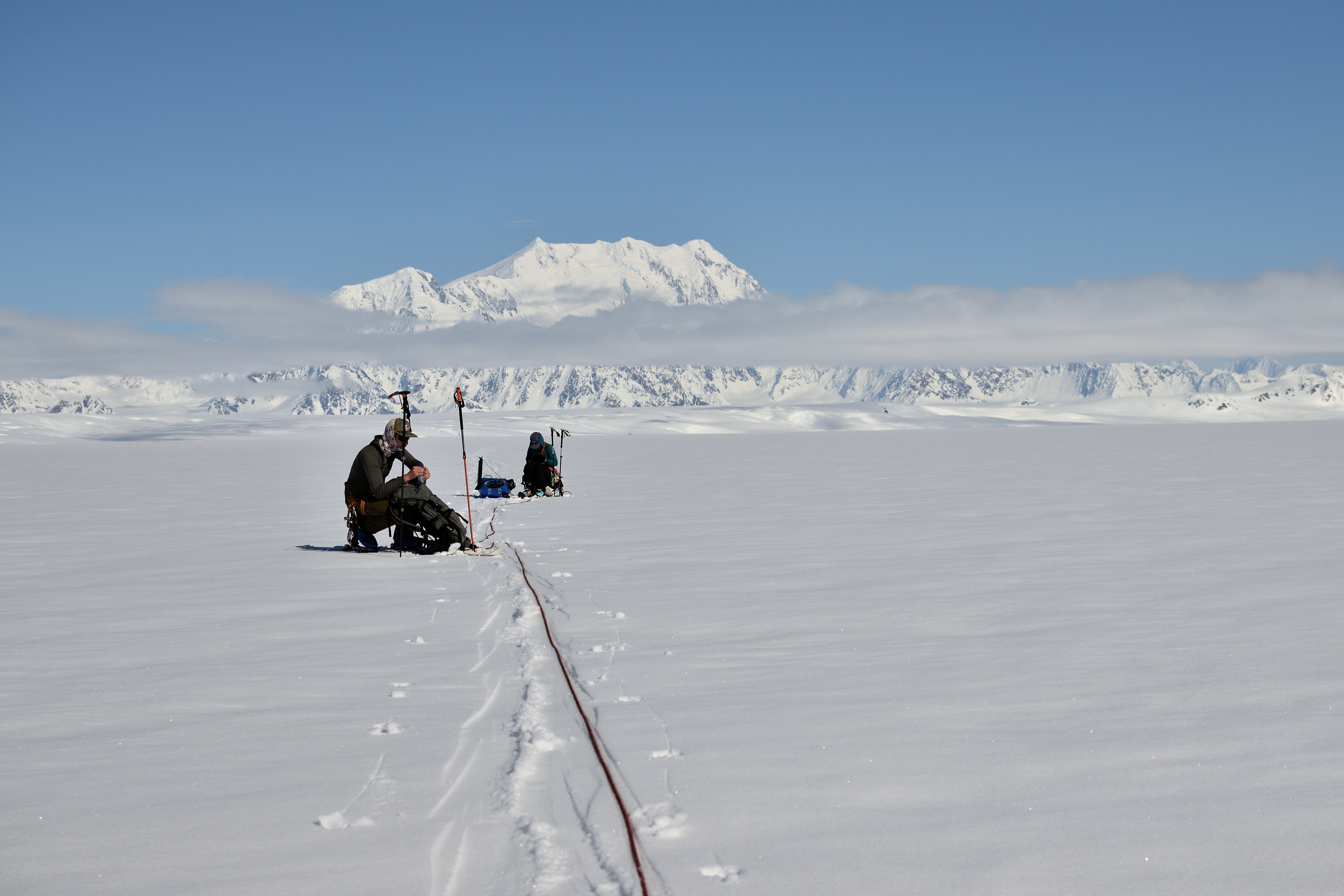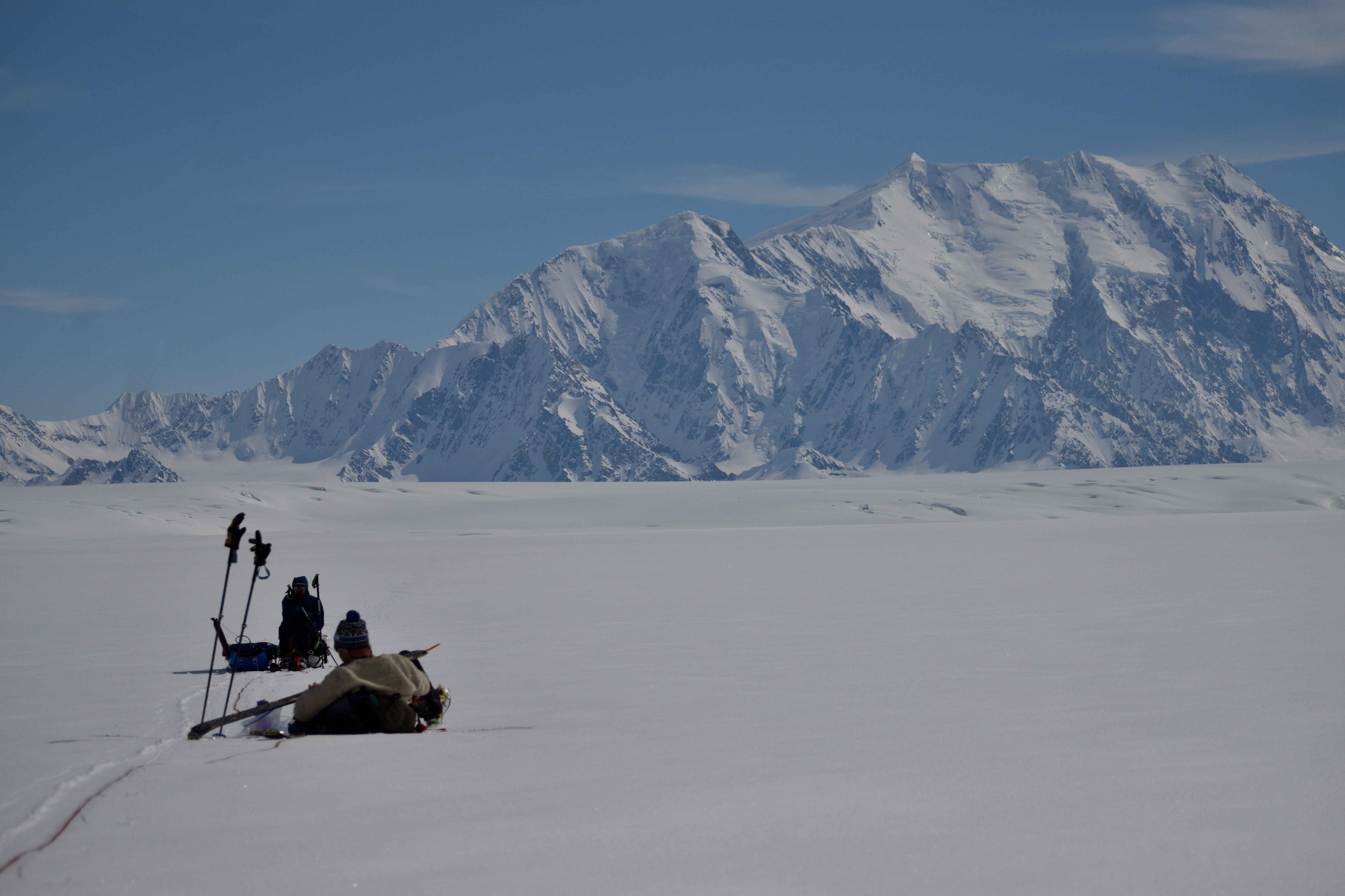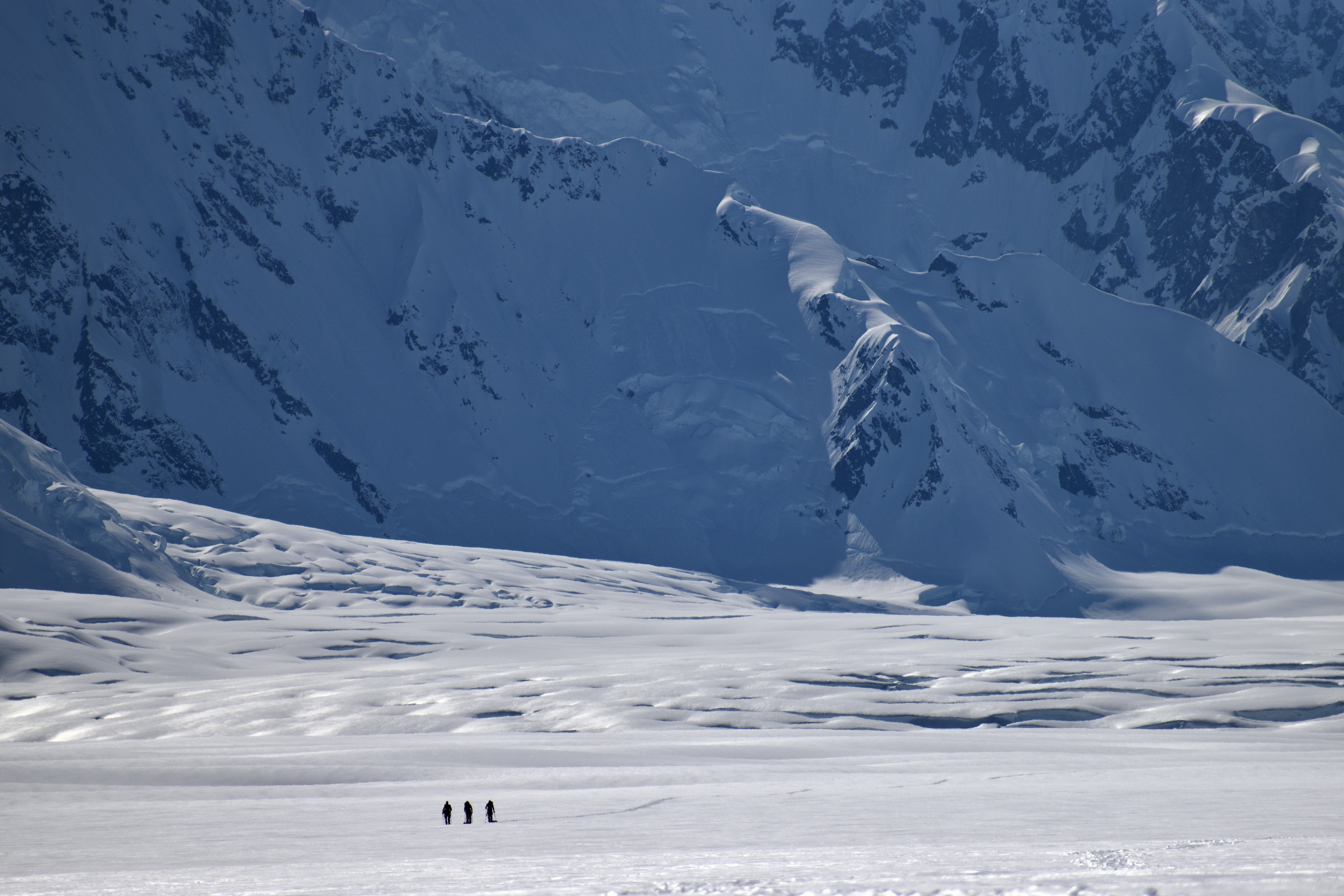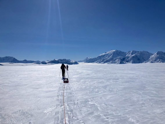2023: A team of three skiing home from a long day of acquiring deep radar on the Seward Glacier. The deep radar can measure the ice thickness of the glacier.