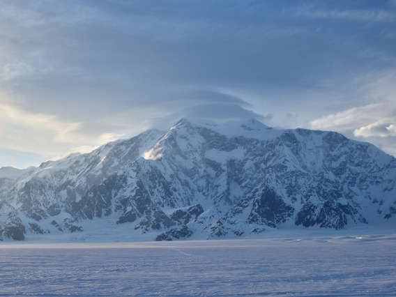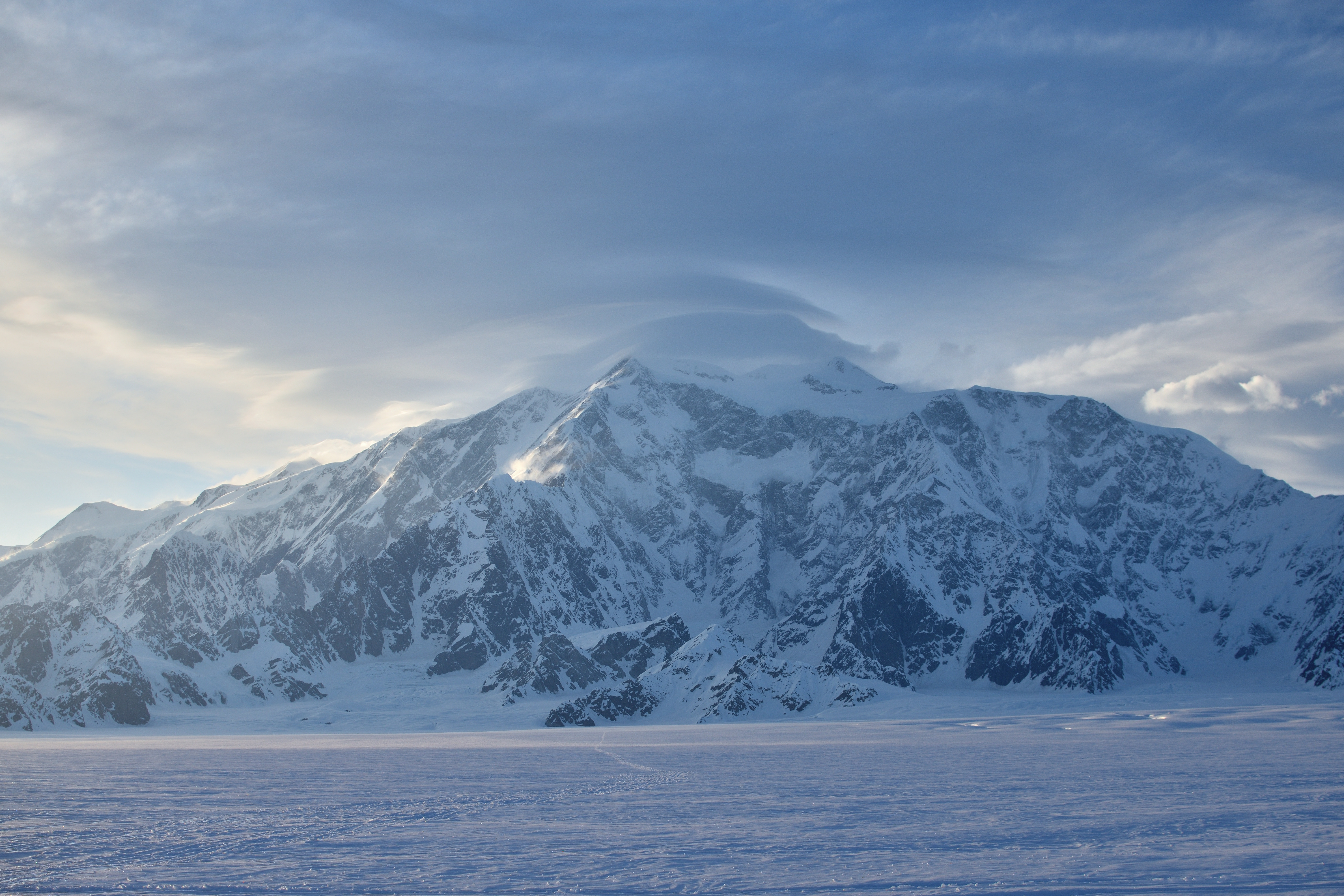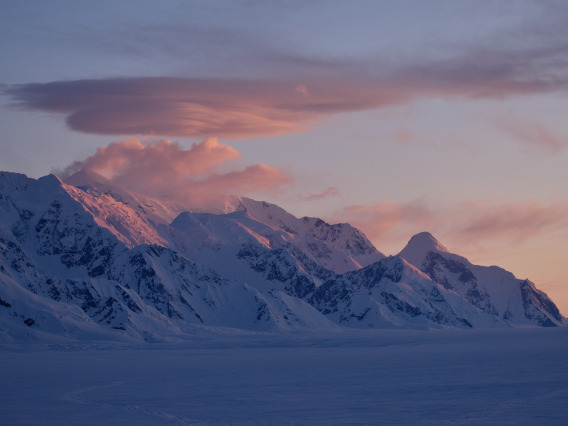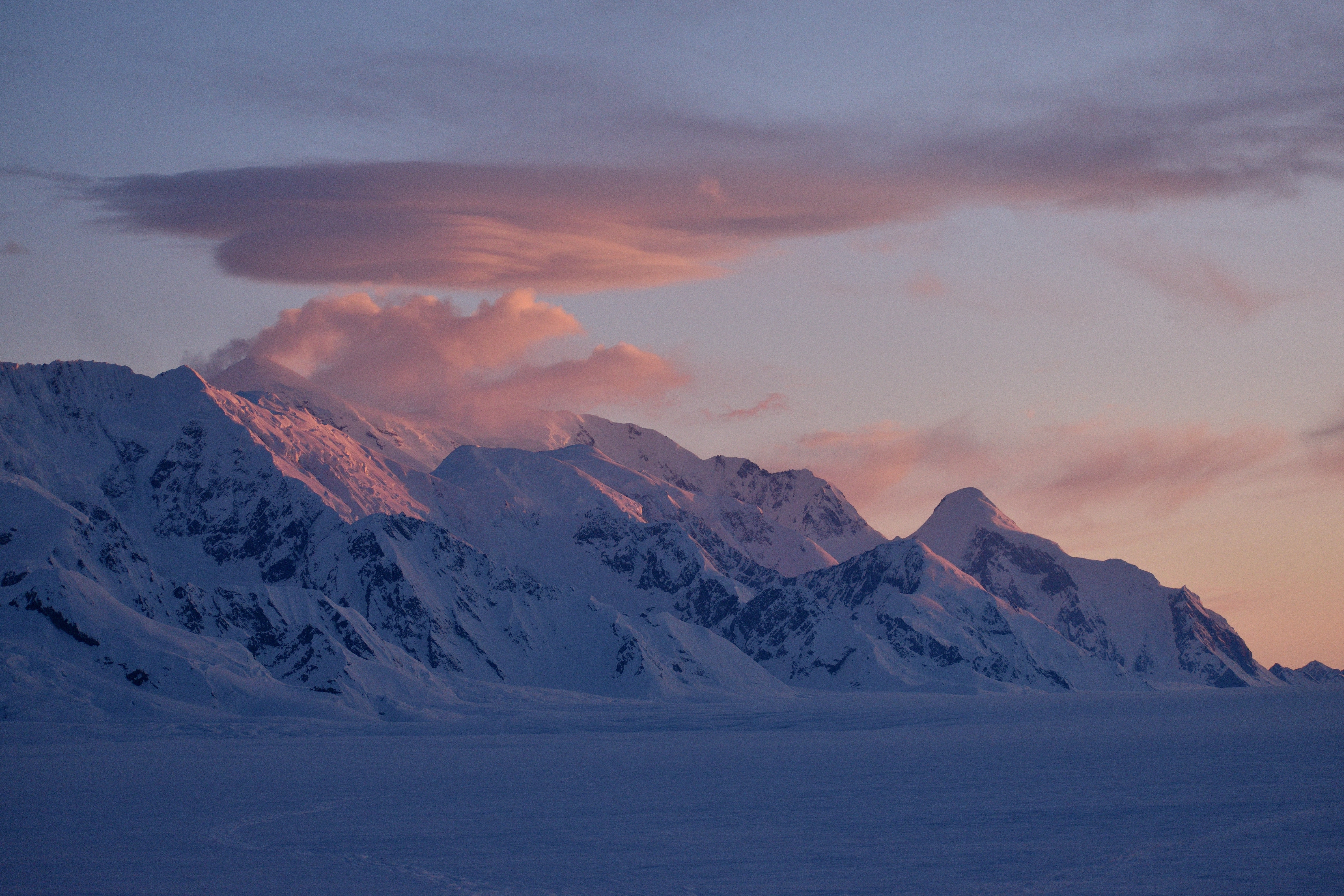2023: Mount Saint Elias at sunset with lenticular clouds.