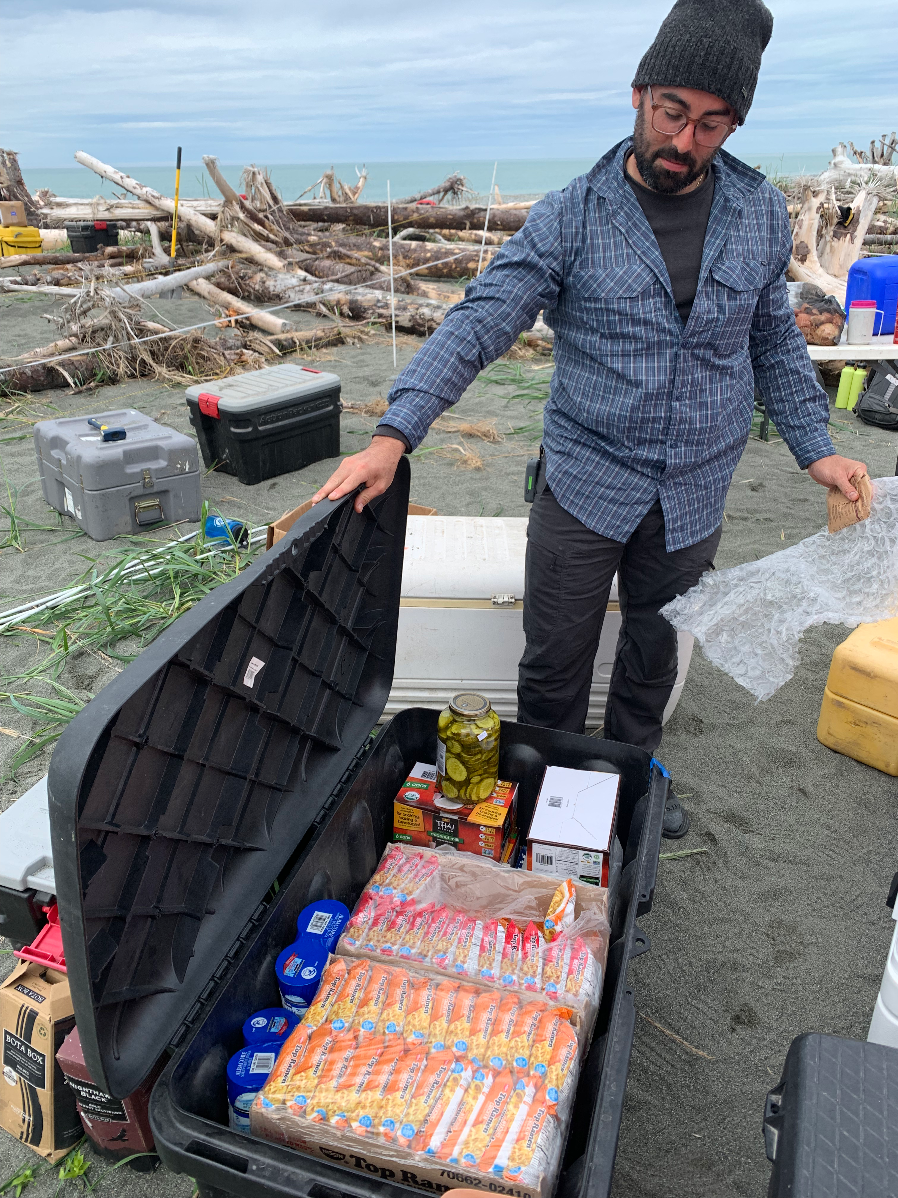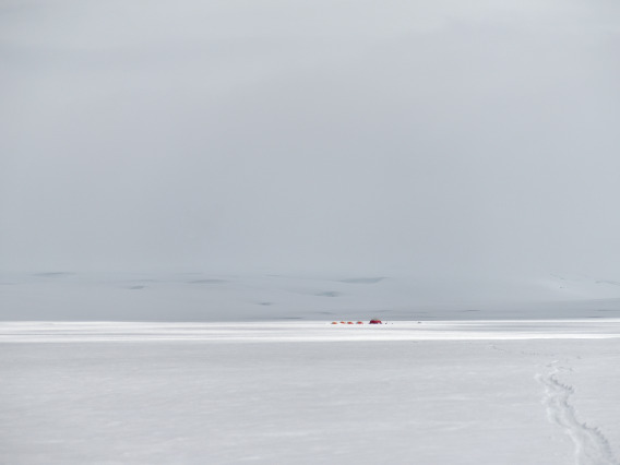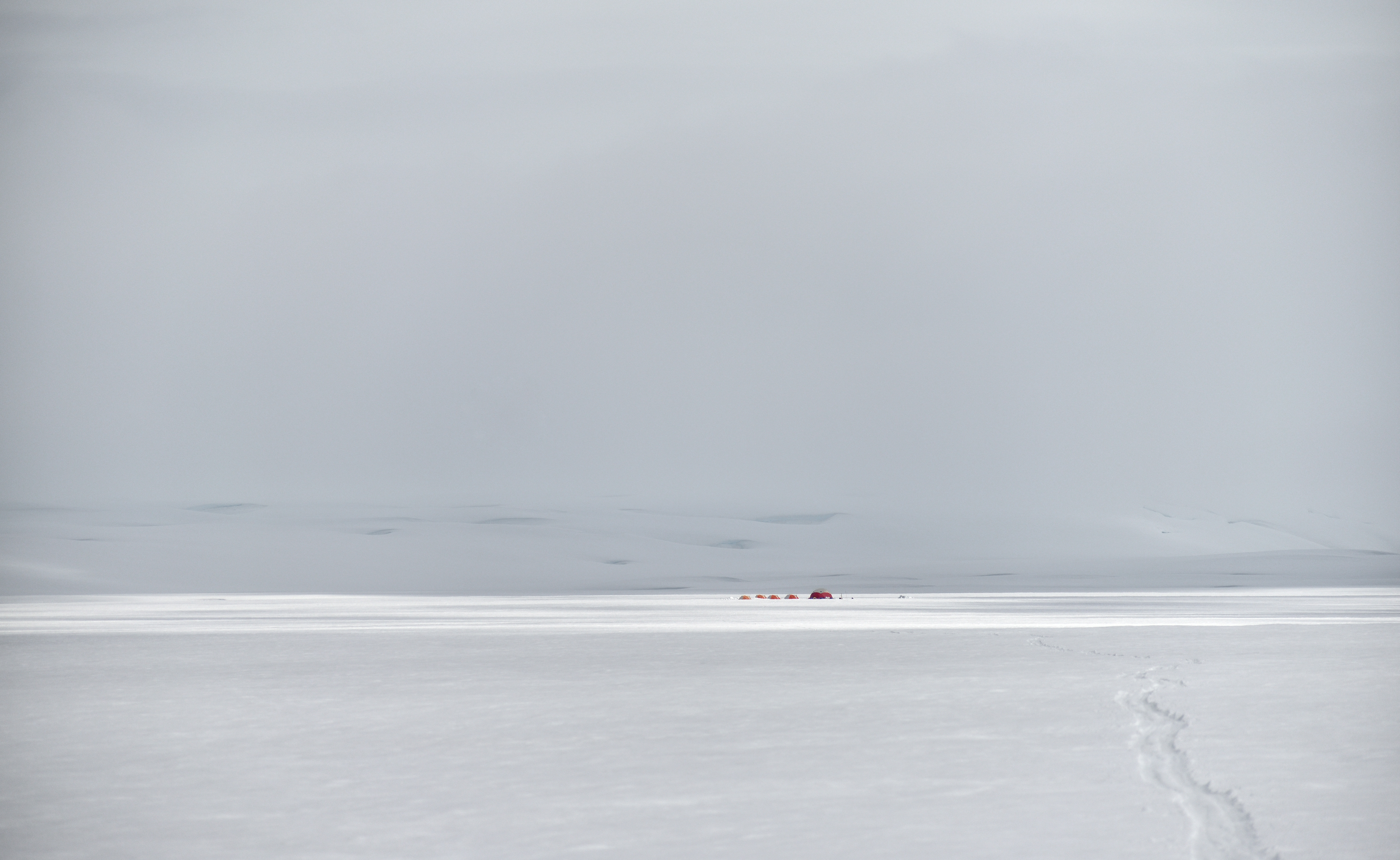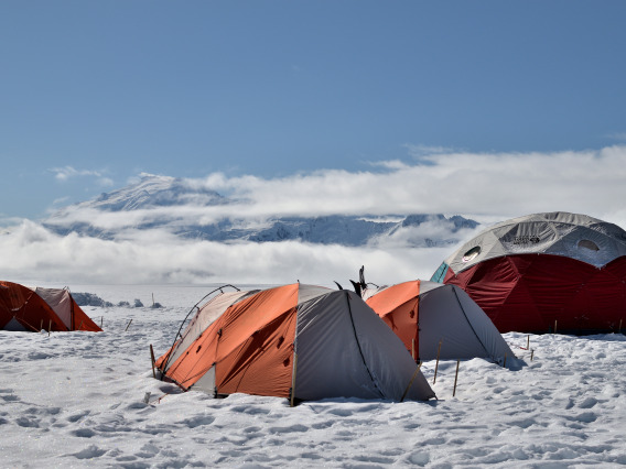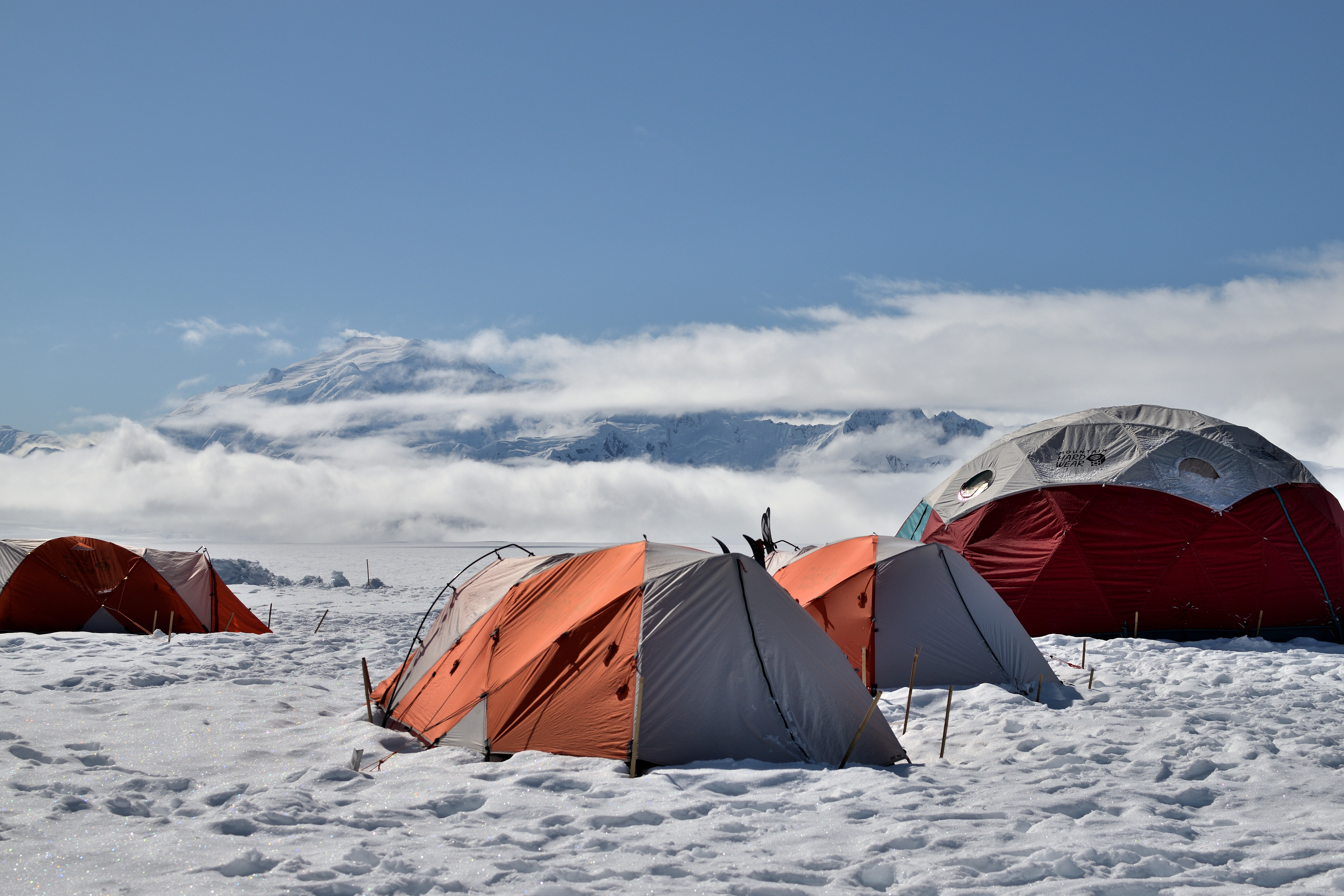 2023: Part of the Seward Glacier camp with clouds and Mount Cook in the background.