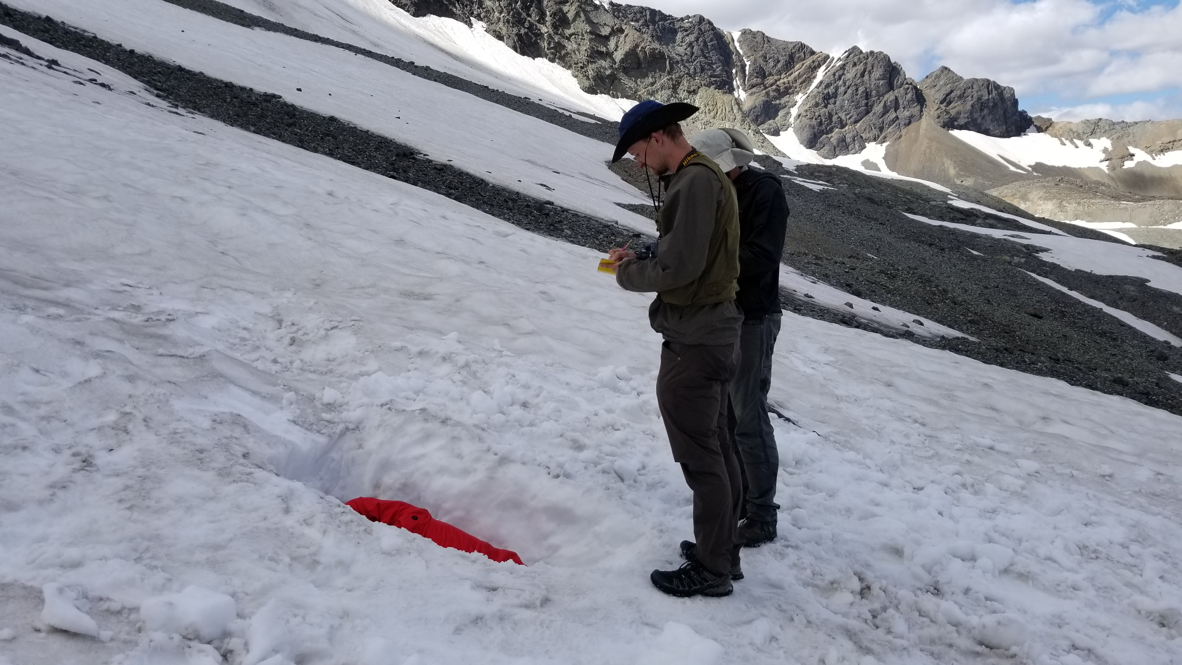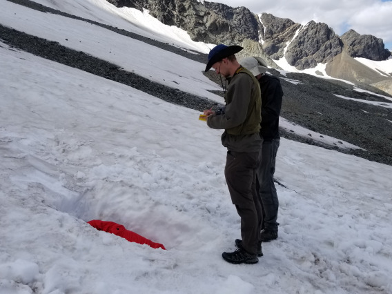 2019: Eric and Tyler look on, making detailed notes, while Brandon excavates a trench into the residual snowpack from the previous winter.