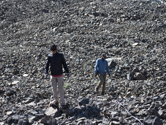 2023: Tyler and Rocío climbing the old Galena road to reach the middle part of the rock glacier.