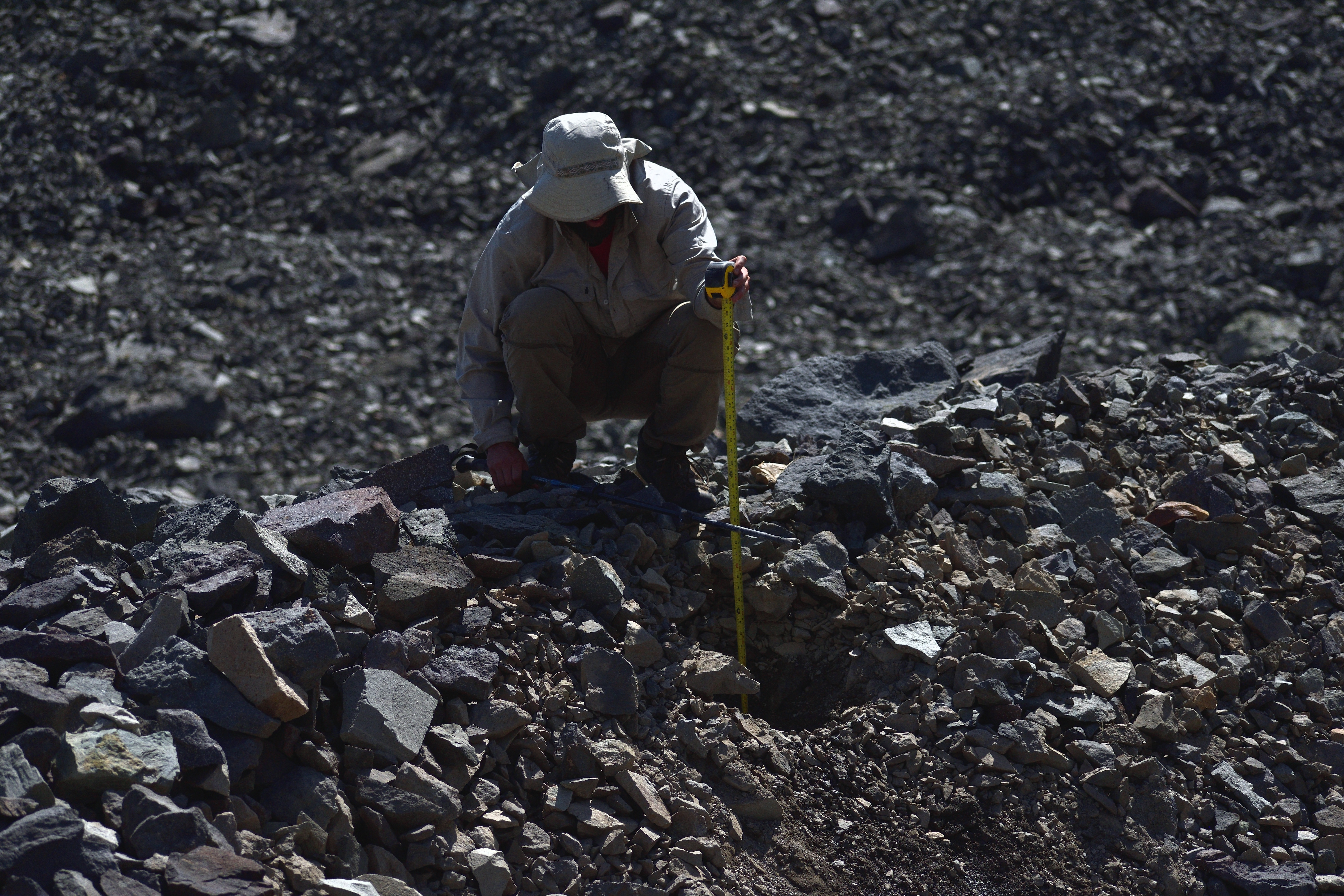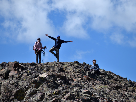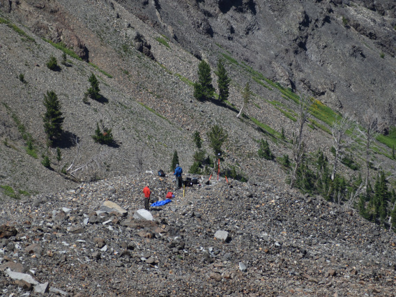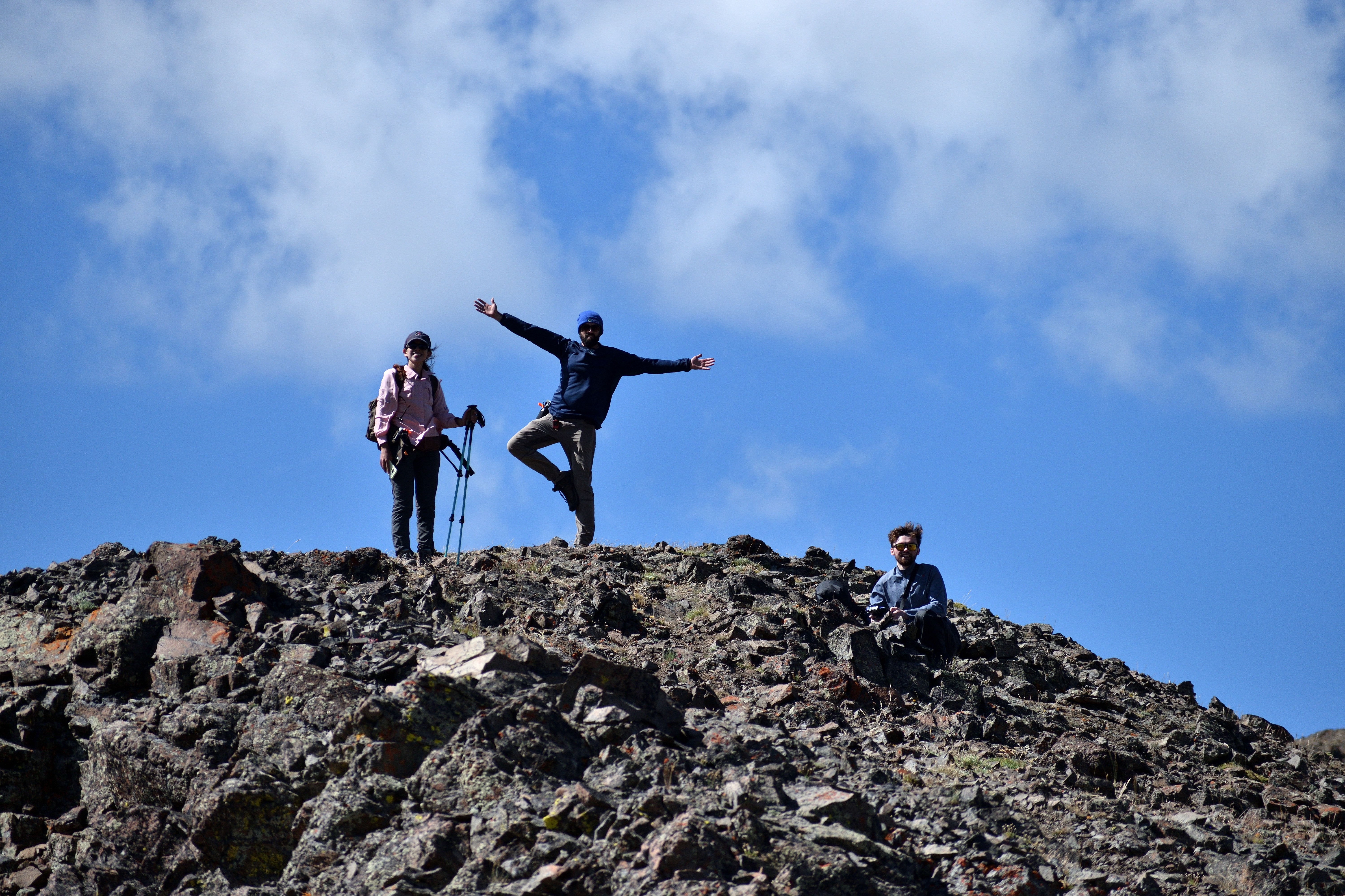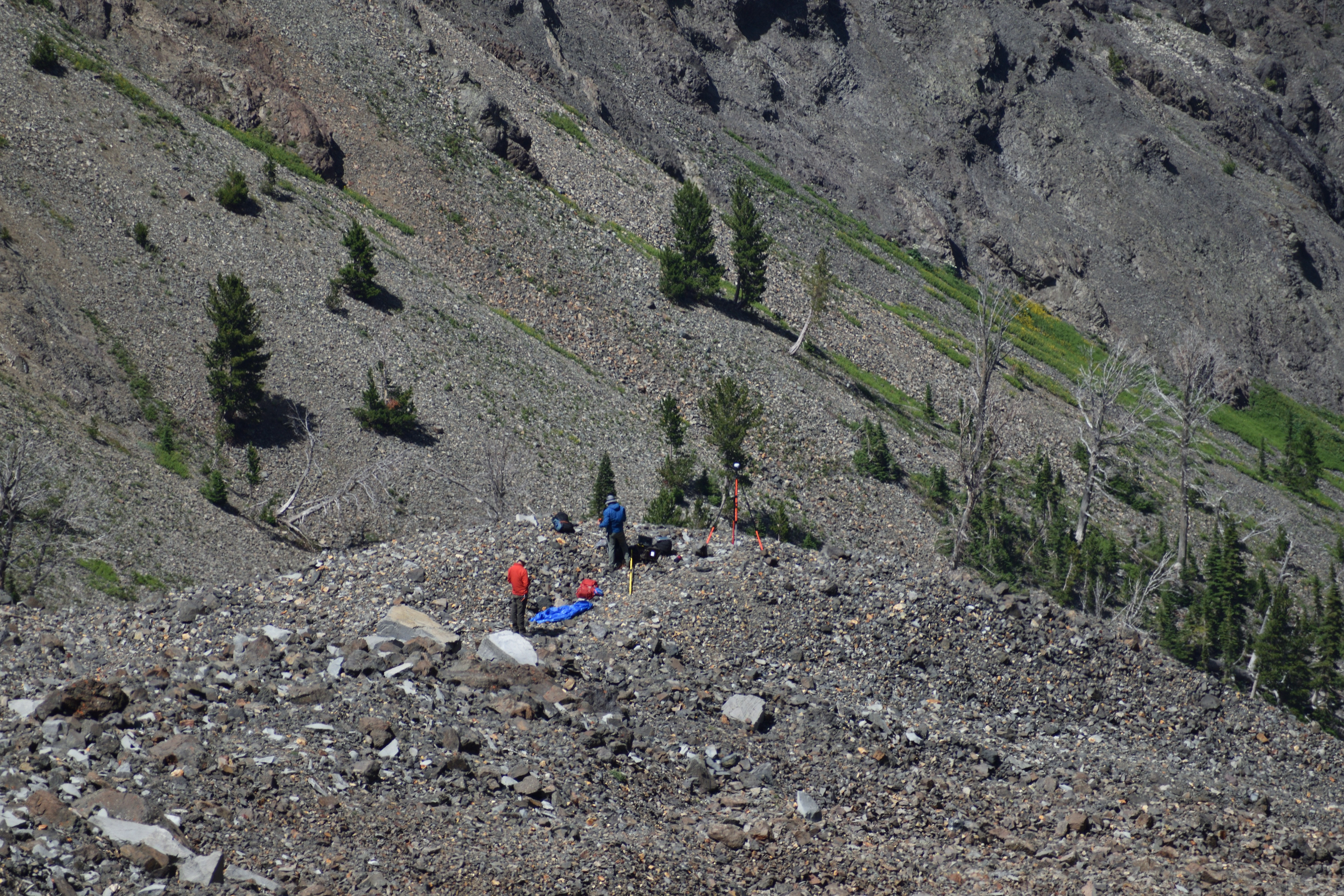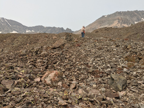 2023: Rocío, Tyler, and Dan on the ridge marked by the USGS survey plate to the west of the Galena Creek Rock Glacier.