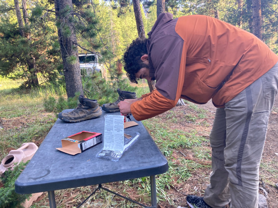 2023: Tyler repairing his hiking boots due to damage from the rock glaciers.
