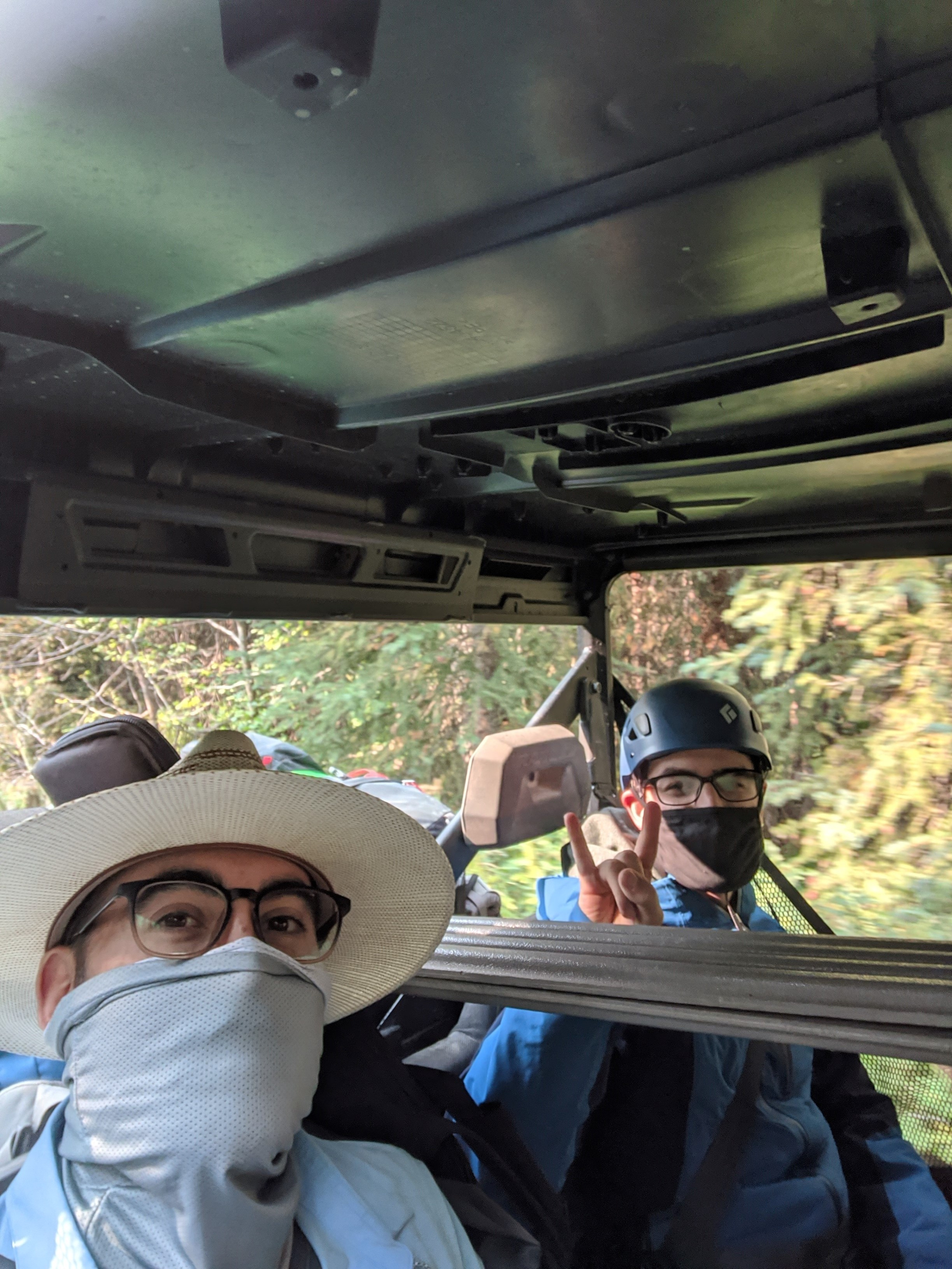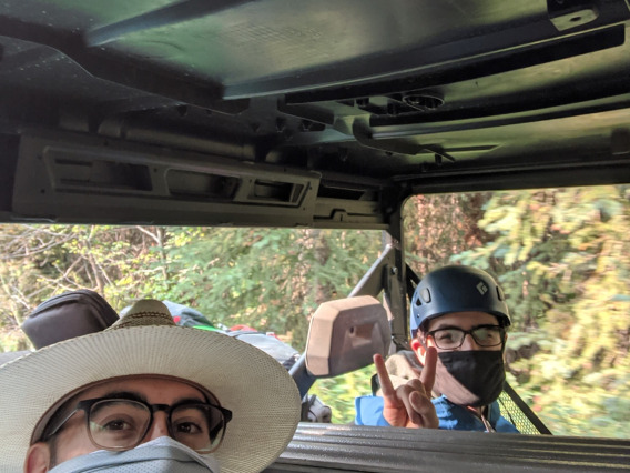 2020: Brandon and Stefano on the daily UTV commute to the rock glacier, practicing dust and COVID safety