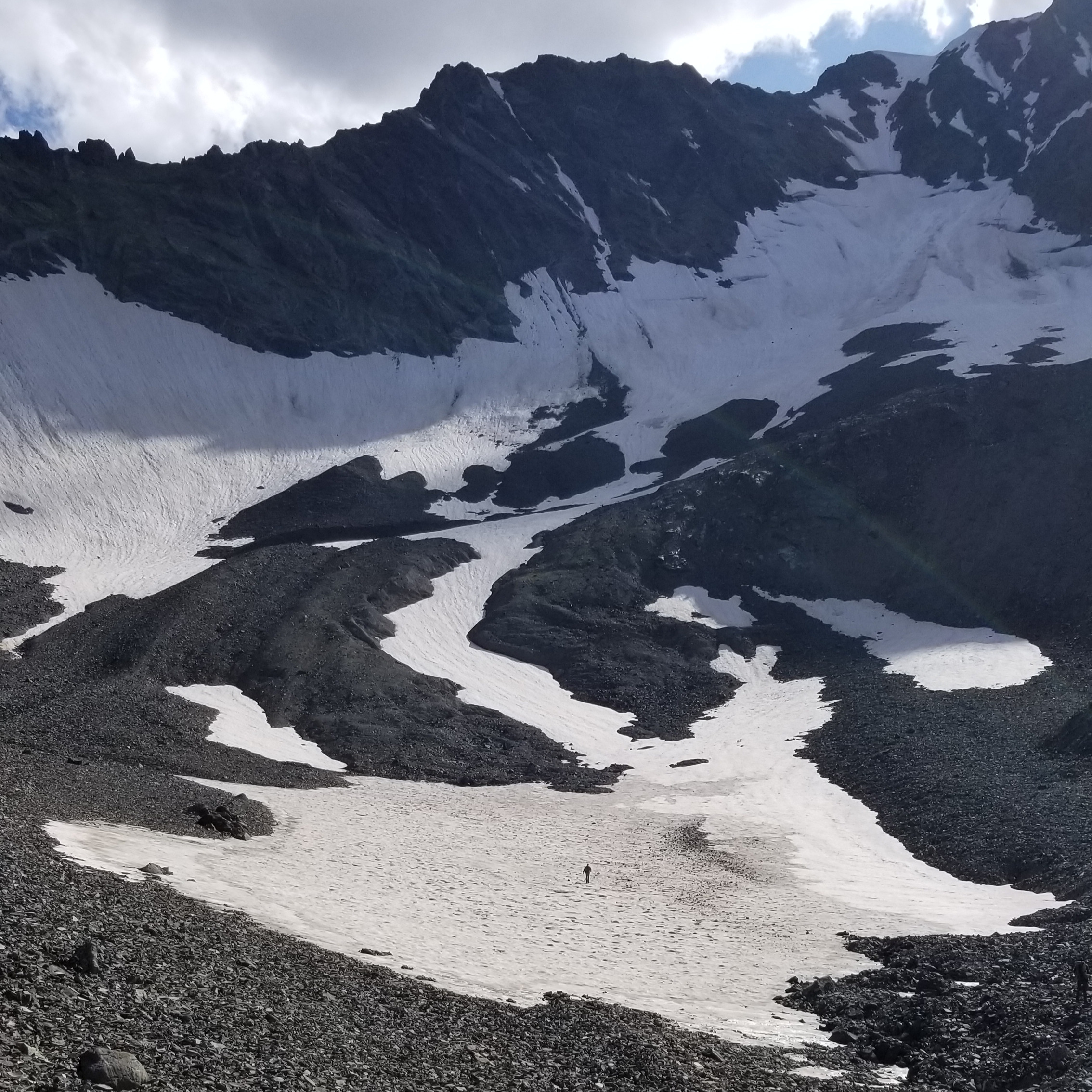 2019: An unknown TAPIR lab member makes their way across a snowfield on the way back to camp, eager for a hot dinner and a good night's rest.
