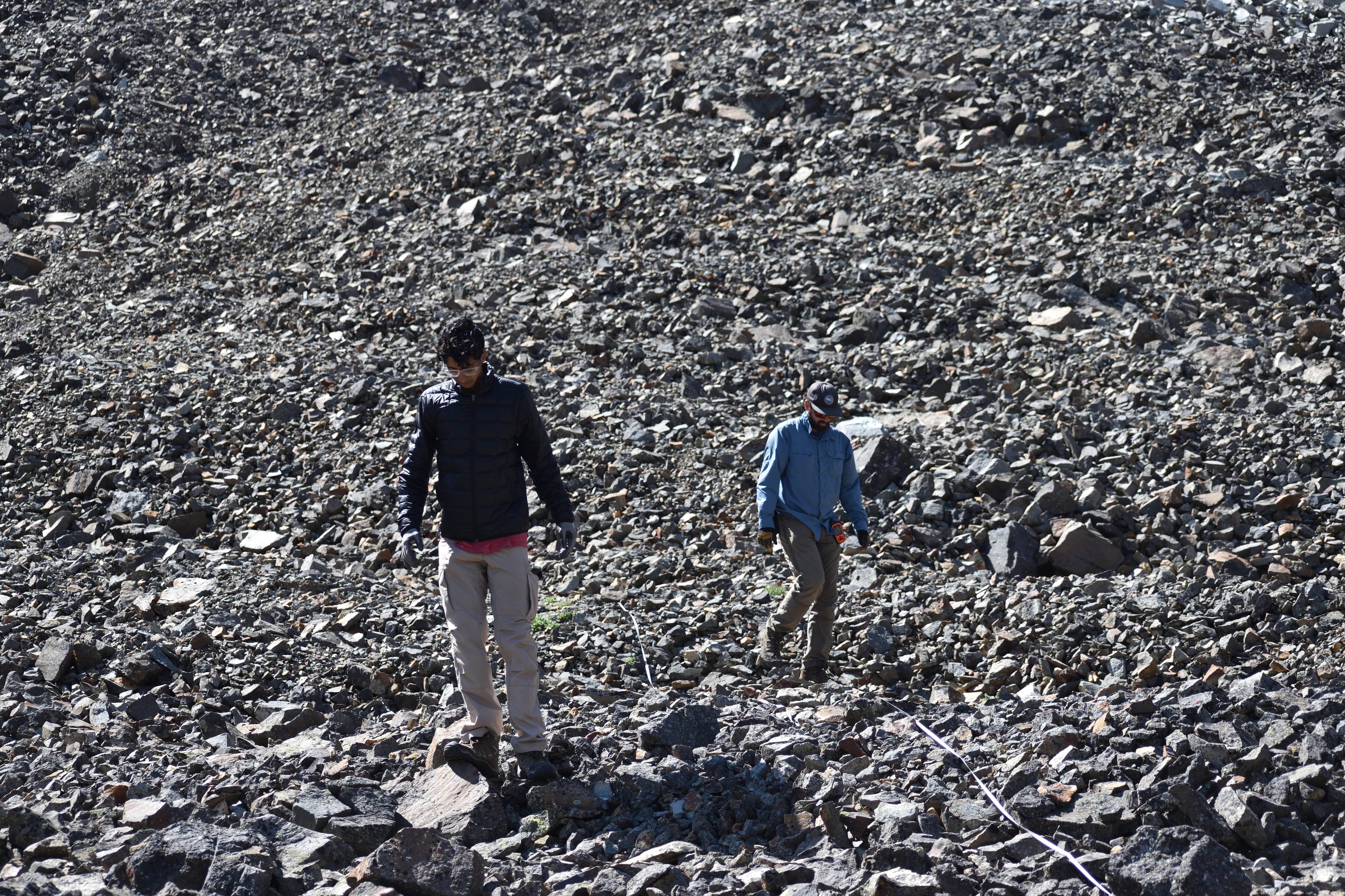 2022: Tyler and Rishi walking back from laying down a tape measure in preparation for GPR acquisition on Galena Creek Rock Glacier.
