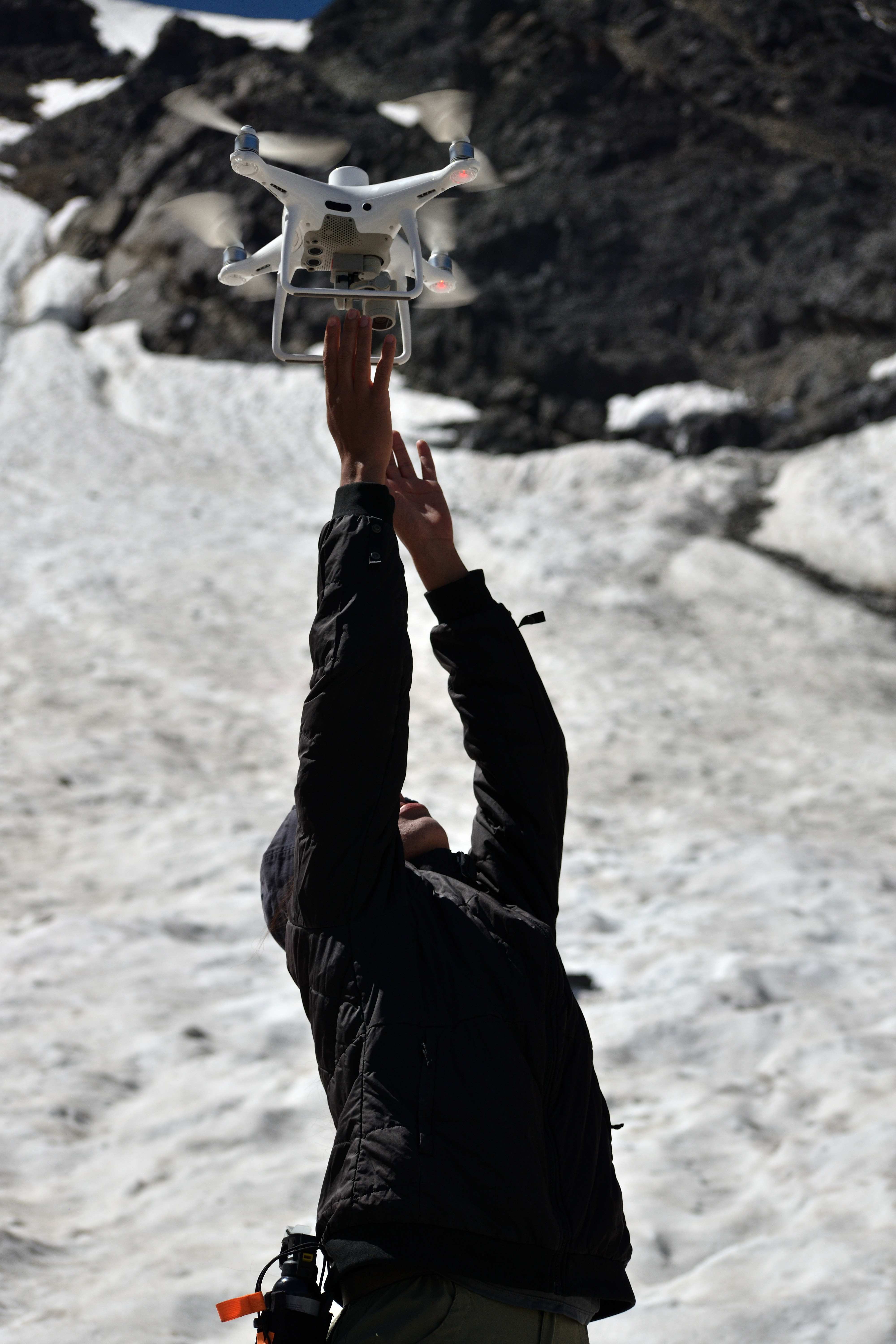 2023: Rocío catching the photogrammetry drone to change out batteries.