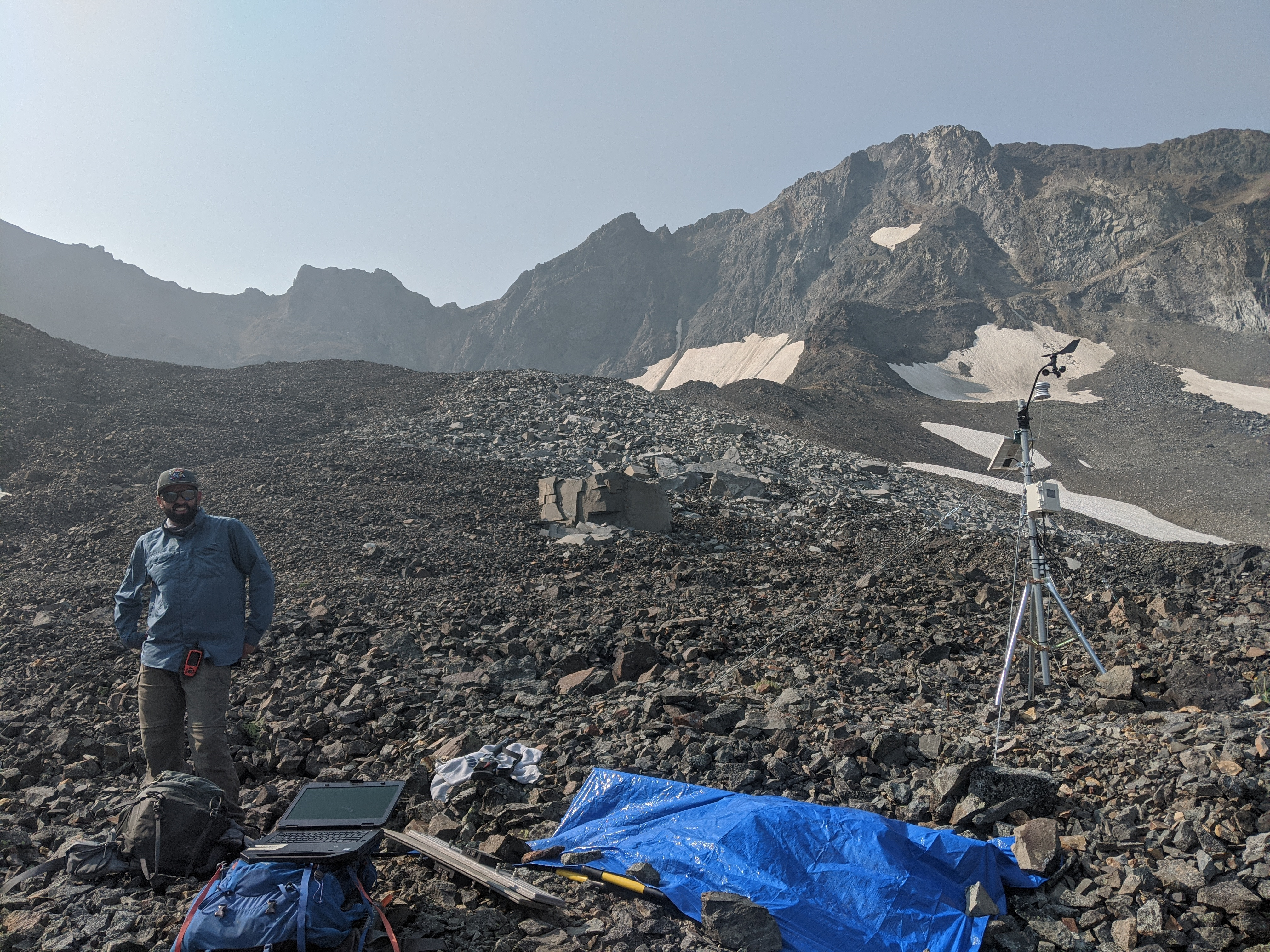 2020: Tyler in front of the HOBO weather station and instrument cache on Galena Creek Rock Glacier